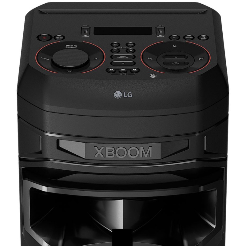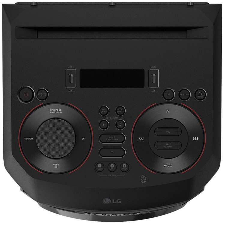 سیستم صوتی 2 کاناله ال جی XBOOM RNC9 امکانات هوشمند و قابلیت های بسیار خوبی در اختیار شما قرار می دهد تا به راحتی یک مهمانی و پارتی لذت بخش را برپا کرده و مدیریت کنید. ال جی برای این سیستم صوتی برنامه LG XBOOM را برای موبایل های هوشمند اندرویدی و iOS توسعه داده است و شما با نصب آن روی موبایل خود می توانید به راحتی به این سیستم صوتی متصل شده و کنترل کاملی روی آن داشته باشید. برنامه LG XBOOM قابلیت هایی مانند DJ Scratcher، DJ Effects، Sampler Creator و DJ Loop را در اختیار شما قرار می دهد که می توانند جذاب باشند. سیستم صوتی پیش روی شما دارای قابلیت Juke Box است و شما می توانید آهنگ های دلخواه خود را از طریق حافظه فلش به صورت یک لیست پخش دسته بندی کرده و از آن لذت ببرید. علاوه بر آن دارای قابلیت Multi Juke Box است که به شما اجازه می دهد هم زمان 3 موبایل هوشمند را از طریق بلوتوث به آن متصل کرده و یک لیست مشترک از آهنگ های دلخواه را ایجاد نمایید و آهنگ ها را به ترتیبی که می خواهید پخش کنید. توجه داشته باشید که اتصال هم زمان 3 موبایل هوشمند در صورتی انجام خواهد گرفت که موبایل شما سیستم عامل اندروید داشته باشد. یکی دیگر از قابلیت های جذاب این سیستم صوتی، قابلیت Party Strobe آن است که باز هم متاسفانه تنها در موبایل های هوشمند اندرویدی قابل استفاده است. شما می توانید حداکثر 3 موبایل هوشمند اندرویدی را از طریق برنامه LG XBOOM به سیستم صوتی متصل کرده و از نور فلش آنها به عنوان افکت های رقص نور استفاده کنید. سیستم صوتی پیش روی شما در مجموع 20 حالت صدا یا اکولایزر پیش فرض و مختلف دارد که می توانید آنها را انتخاب کنید. همینطور دارای قابلیت User EQ است و به شما اجازه می دهد تا حالت صدا و اکولایزر دلخواه خود را به صورت دستی تنظیم کرده و آن را شخصی سازی کنید. این سیستم صوتی دارای 2 پورت USB است و شما می توانید آهنگ های مد نظر خود را از طریق حافظه فلش پخش نمایید. ال جی از یک فایل منیجر ساده در این سیستم صوتی استفاده کرده تا به راحتی بتوانید بین فایل ها و پوشه های حافظه فلش خود آهنگ ها را جستجو و پخش کنید و حتی آنها را پاک کنید. یکی از ویژگی های منحصر به فرد این سیستم صوتی قابلیت USB Direct Recording و USB Copy می باشد و به این معنا است که شما می توانید صدای میکروفون و گیتار و DJ Pad را در هنگام استفاده ضبط کنید. همینطور می توانید آهنگ های دلخواه خود را از یک USB در USB دیگر کپی کنید. یکی از ویژگی های جذاب این سیستم صوتی، قابلیت کارائوکه (Karaoke) آن می باشد. شما می توانید یک میکروفون و گیتار را به آن متصل کرده و صدای خواننده آهنگ را توسط قابلیت Voice Canceller حذف کنید (البته به طور کامل حذف نمی شود و در واقع کم می شود) و اقدام به خوانندگی و نوازندگی روی آهنگ نمایید یا مسابقه خوانندگی اجرا کنید. این قابلیت برای دورهمی ها و مهمانی ها می تواند جذاب و سرگرم کننده باشد. علاوه بر آن حالت های دیگر کارائوکه مانند Key Changer، Mic Echo و Vocal Effects نیز در اختیار شما قرار گرفته است که می توانید با توجه به نیاز خود از آنها نیز استفاده کنید. این سیستم صوتی دارای رادیو نیز می باشد و شما می توانید به کانال های رادیویی FM نیز گوش کنید. حتی می توانید تا 50 ایستگاه رادیویی را ذخیره کنید و هر زمان که خواستید، به آنها گوش دهید. یکی دیگر از قابلیت های بسیار کاربردی این سیستم صوتی، قابلیت Wireless Party Link یا Twin Mode است. این قابلیت به شما اجازه می دهد تا سیستم صوتی را به یک سیستم صوتی ال جی مشابه دیگر (در صورتی که سیستم صوتی از قابلیت Wireless Party Link برخوردار باشد) متصل نمایید و صدای قدرتمندتر و با کیفیت تری را تجربه کنید. این قابلیت به شما اجازه می دهد تا کنترل کاملی روی جشن و مهمانی خود داشته باشید. سیستم صوتی 2023 ال جی RNC9 دارای رقص نور یا Multi Color Speaker Lighting نیز می باشد که به صورت RGB قابل تنظیم است. البته این رقص نور تنها محدود به بلندگوهای ووفر آن است و بیشتر در تاریکی و محیط کم نور به چشم می آید. رقص نور این سیستم صوتی در 3 حالت پیش فرض قابل تنظیم است و علاوه بر آن می توانید ا