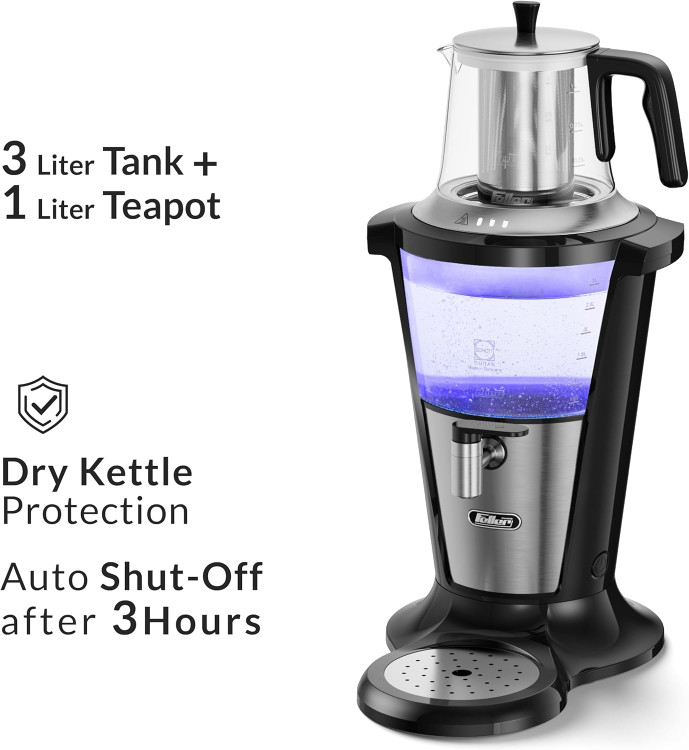 سماور برقی شیشه ای فلر با طراحی زیبا و خوش ساخت جلوه شیکی به آشپزخانه شما می بخشد و بسته به دکوراسیون و سلیقه تان می توانید یکی از دو رنگ مشکی و یا سفید را انتخاب کنید. ظرفیت بالای این سماور و قوری آن را برای خانواده های پرجمعیت و مهمانی ها مناسب کرده است. سماور 3 لیتری و قوری 1 لیتری تجربه لذت بخشی از دم کردن چای و به حداقل رساندن پر کردن مجدد را فراهم می کند.
