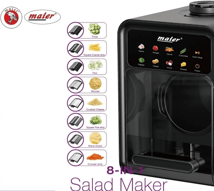این وسیله ی برقی با توان مصرفی ۸۰۰ وات قدرت بالایی در خرد کردن انواع مواد غذایی دارد. این محصول دارای ۸ تیغه از جنس استیل ضد زنگ است که مواد غذایی را در ۸ نوع و مدل متفاوت رنده میکند. این سالاد ساز دارای پنل لمسی کاربری دیجیتال برای اعمال تنظیمات دستگاه و انتخاب نوع مواد غذایی است.