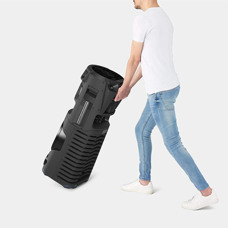 از جمله ویژگیهای دیگهای که روی بدنه این اسپیکر به چشم میخوره، وجود نور RGB با امکان رقص نور، ورودی گیتار و میکروفون، درگاههای ارتباطی HDMI و USB و همچنین AUX اونه. یه صفحه نمایش LED هم روی بدنه اسپیکر تعبیه شده که تنظیماتش رو نشون میده. از نکات مثبت دیگه این محصول، مقاومت بالاییه که در برابر آب داره و این قابلیت با نماد IPX5 نشون داده شده.