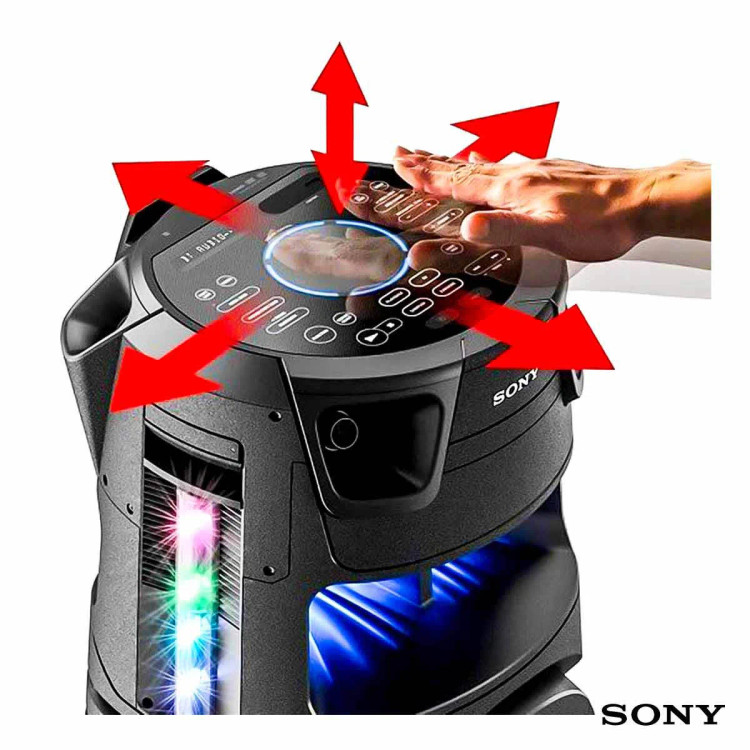 اسپیکر سونی MHC-V73D را میتوانید با حرکت دست کنترل کنید! یعنی با تکان دادن دست میتوان آهنگ را عوض، میزان صدا را تغییر داد یا از افکتهای صوتی استفاده کرد. این قابلیت حتی در تاریکی نیز عملکرد دقیق و سریع دارد.