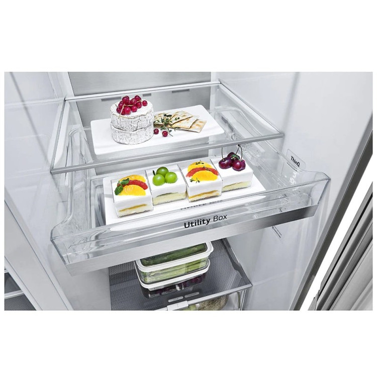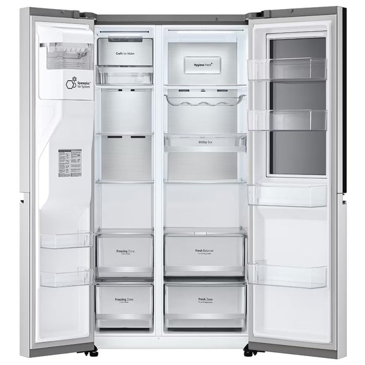 یکی از ویژگیهای برجسته مدل GC-X257CSHS، سیستم InstaView است که به شما این امکان را میدهد داخل یخچال را بدون نیاز به باز کردن آن ببینید که به صرفه جویی در مصرف انرژی و تازه نگه داشتن غذا برای مدت طولانیتری کمک میکند. پنجره مخفی است و با دو ضربه روشن میشود بنابراین میتوانید به راحتی اقلامی که در این بخش قرار دارند مشاهده نمایید و دسترسی سریعی را به آنها داشته باشید. این صفحه شیشهای زیبا و شیک بر روی درب یخچال قرار داده شده است. این بخش را میتوانید از طریق اهرم کوچکی که در قسمت میانی یخچال وجود دارد باز و بسته نمایید. یخچال فریزر ال جی GR-X267CSHS از دو بخش یخچال و فریزر تشکیل شده است. در بخش یخچال میتوانید شاهد حضور 4 طبقه شفاف شیشهای حرارت دیده باشید که وزن اقلام غذایی را به خوبی تحمل میکنند. بر روی درب یخچال هم تعداد 4 قفسه کار گذاشته شده است که جهت نگهداری بطریهای بلند میتوانید از آنها استفاده کنید. در قسمت پایین طبقات کشوی Fresh Balancer حضور دارد که میتوانید میزان رطوبت داخل آن را تنظیم کنید. این کشو جهت نگهداری میوه و سبزیجات کاملا مناسب و ایدهآل میباشد. همچنین این یخچال فریزر 674 لیتر ال جی از وجود کشوی Fresh Zone هم بهره میبرد که به حفظ و ماندگاری بیشتر میوه و سبزیجات کمک میکند. در قسمت میانی یخچال هم کشوی Utility Box وجود دارد که برای نگهداری اقلام غذایی کوچک کاربردی میباشد. بر روی درب فریزر هم تعداد 2 درب شیشهای وجود دارد. ضمن اینکه در این بخش میتوانید محفظه یخساز خودکار که از نوع SpacePlus Ice System را مشاهده نمایید. این محفظه فضای کمی را برای قرارگیری اشغال خواهد کرد. شما میتوانید از طریق بخش یخریز با توجه نیاز خود یخهای حبهای و خرد را دریافت کنید. همچنین در بخش فریزر این یخچال هوشمند ال جی محفظه (Craft Ice Maker) که تولید یخ کروی میکند قرار دارد اما این یخ تولیدی از طریق یخریز در دسترس نیست و شما باید فریزر را باز کرده و یخهای کروی شکل را از داخل محفظه مخصوص بردارید. دو کشوی Freezing Zone هم در بخش فریزر حضور دارد که برای قرار دادن گوشتها میتوانید از آن استفاده کنید. در بالای این کشوها 3 طبقه وجود دارد که به خوبی میتوانند وزن اقلام غذایی را تحمل کنند. در هر دو بخش یخچال و فریزر لامپهای LED قرار داده شده است که روشنایی آن نسبت به لامپهای معمولی کارآمدتر است و عمر طولانیتری دارد. بنابراین در شب هنگام به راحتی میتوانید فضای داخلی را مشاهده نمایید و سریعتر به مواد غذایی دسترسی داشته باشید.