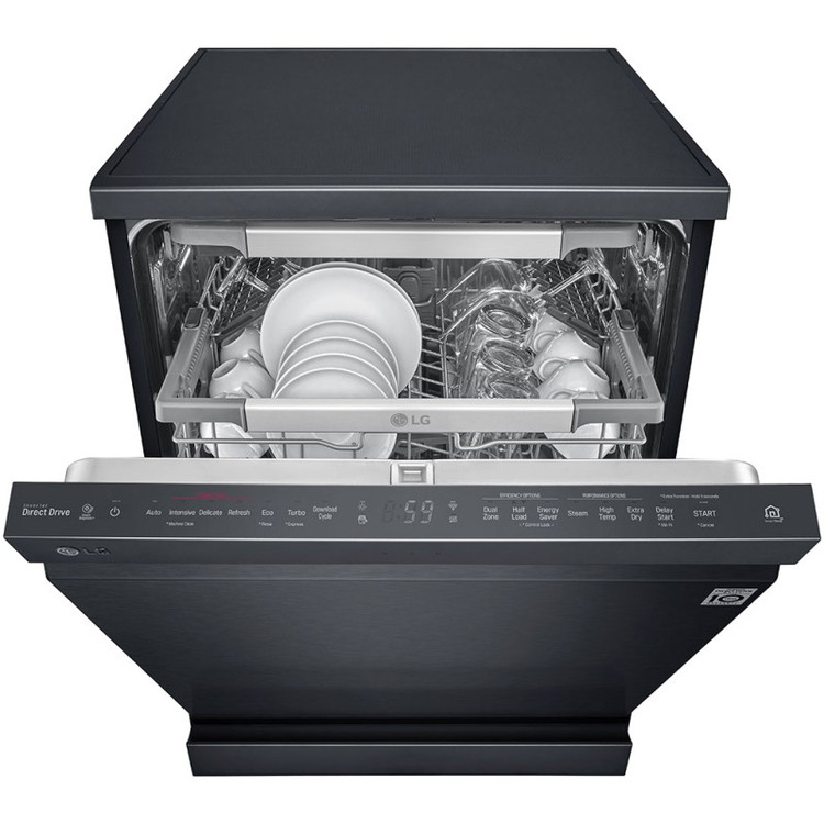 ماشین ظرفشویی اسمارت ال جی DFB325HM رنگ مشکی دارای وای فای (Wi-Fi) است و از اینترنت اشیا (IoT) نیز پشتیبانی میکند. بنابراین میتوانید با نصب برنامه LG ThinQ روی موبایل هوشمند (اندروید و iOS) خود، این ظرفشویی را از طریق موبایل مدیریت و کنترل نمایید. همچنین این محصول قابلیت عیبیابی هوشمند (Smart Diagnosis) نیز دارد و در زمان بروز مشکل از طریق برنامه LG ThinQ راه حلهایی را به شما پیشنهاد میدهد. در صورتی که مشکل جدی و تخصصی نباشد شما میتوانید با توجه به راه حل های پیشنهادی و بدون نیاز به متخصص فنی، خودتان آن را رفع نمایید. ماشین ظرفشویی پیش روی شما مجهز به سیستم Aqua-Stop است که از نشت آب در محیط جلوگیری خواهد کرد. سیستم مذکور دارای سنسور مخصوصی میباشد که در ورودی آب به ماشین ظرفشویی قرار دارد و به محض تشخیص نشتی، آب ورودی به دستگاه را قطع می کند تا آب در منزل شما پخش نشود. ماشین ظرفشویی مذکور قابلیت Delay Start دارد و در صورتی که میخواهید دستگاه با تاخیر و دیرتر شروع به کار کند میتوانید از آن استفاده نمایید. با فشار دادن هر بار این دکمه یک ساعت به زمان تاخیر اضافه خواهد شد. در این مدل شما میتوانید زمان تأخیر را از 1 تا 12 ساعت، با فواصل یک ساعته تنظیم کنید. به لطف قابلیت قفل کودک یا Control Lock در این محصول میتوانید دکمههای کنترلی دستگاه به جز دکمه پاور را قفل کنید که این قابلیت برای کسانی که کودک خردسال در منزل دارند بسیار کاربردی میباشد و از تغییر تنظیمات در طول یک چرخه جلوگیری خواهد کرد. دکمههای Half Load و Energy Saver را به طور همزمان به مدت 3 ثانیه فشار داده و نگه دارید تا این ویژگی فعال یا غیرفعال شود. هنگام فعال شدن این ویژگی کد نمایشگر CL روی نمایشگر نشان داده میشود. برای شروع یک چرخه جدید، این ویژگی را غیرفعال کنید.